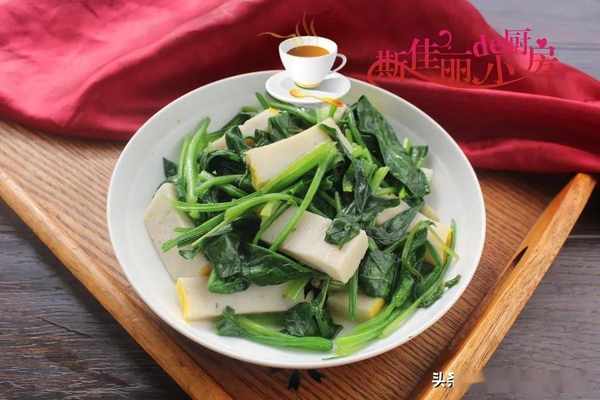 制作: 烧锅水加入少许盐和几滴油,将菠菜放进锅中焯烫变色后捞出备用;热锅凉油,加入少许蒜末进锅煸香,加入鱼糕进锅翻炒;再加入菠菜进锅翻炒几下,最后加入少许盐调味翻炒均匀即可。