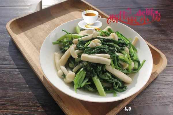 制作:热锅凉油,加入少许蒜末爆香, 加入准备好的海鲜菇进锅煸炒至海鲜菇八、九成熟; 加入洗净的茼蒿进锅后大火快炒,微微变色后加入少许盐调味,翻炒均匀即可。