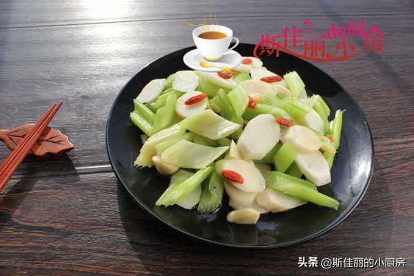 制作: 烧锅水加入少许盐和油,将准备好的铁棍山药放进锅中焯煮2分钟,加入西芹片放入锅中焯烫变色后捞出;烧热锅放入少许油,将1勺蒜末放入锅中炒香,加入西芹和铁棍山药片放进锅中翻炒几下,加入适量的盐调味,最后放入枸杞进锅即可。