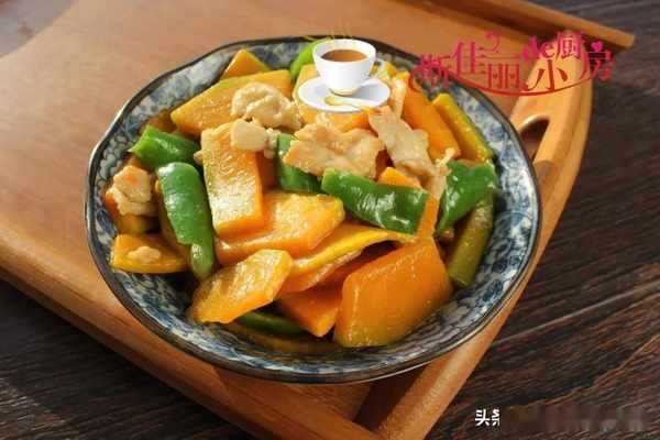 原料: 南瓜 鸡脯肉 青椒 生抽 料酒 淀粉 油盐