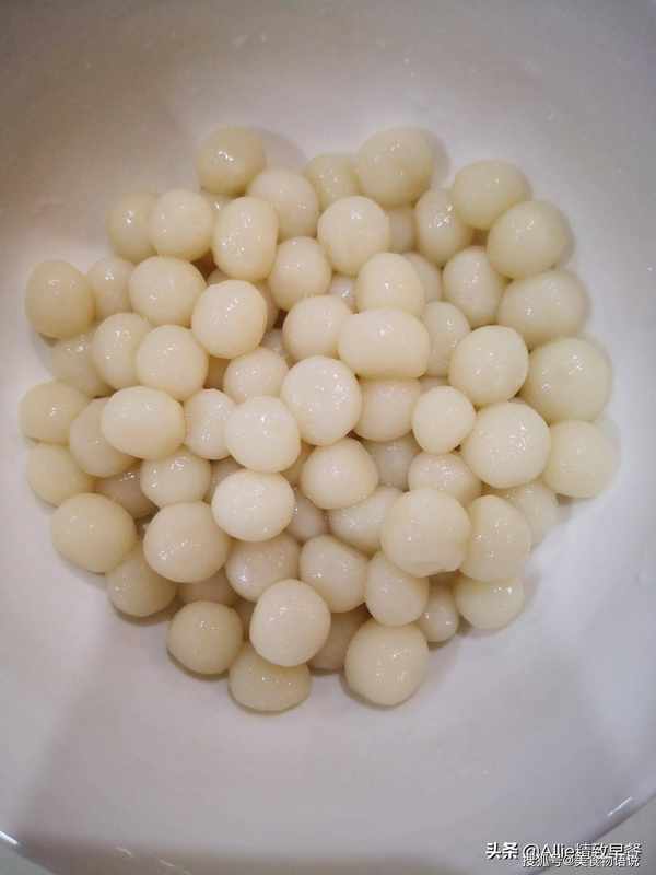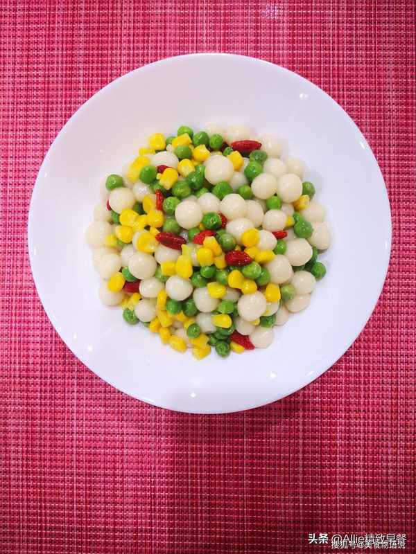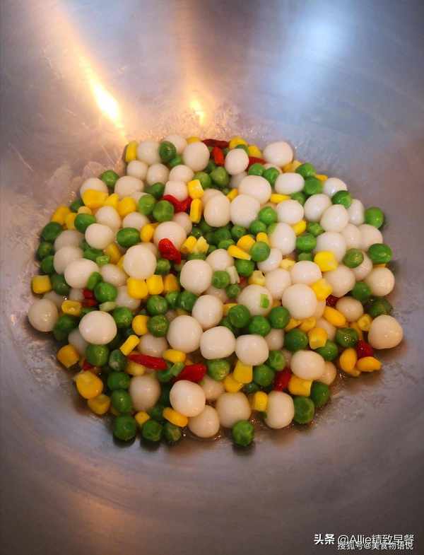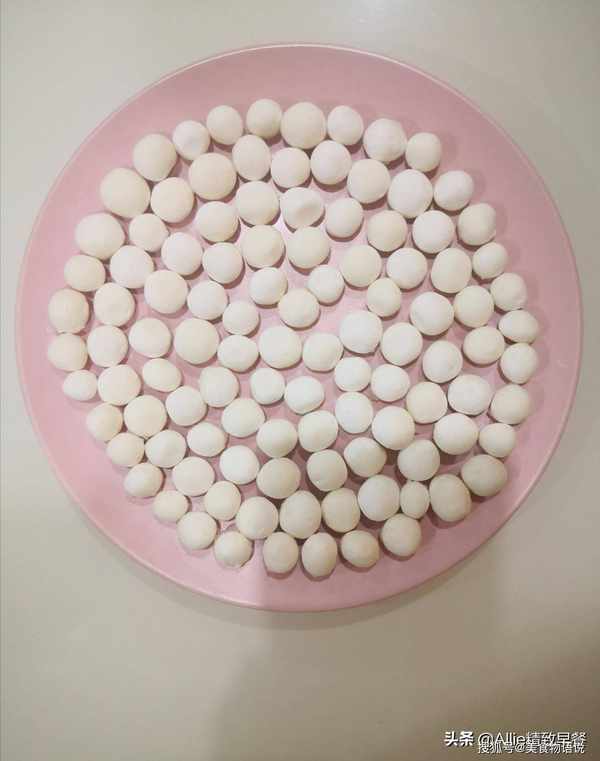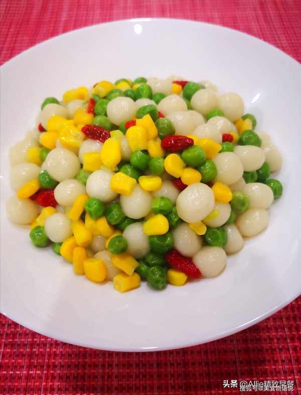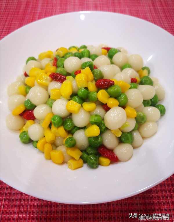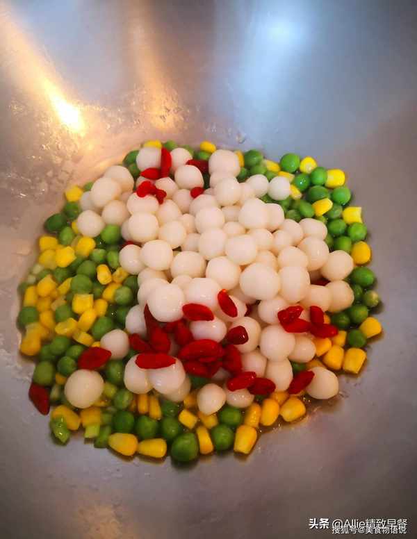 糯米粉、玉米、青豆、枸杞、大葱。调料:盐、油、【实践】糯米粉加入热水,揉成软硬适中的面团,揉成小丸子。