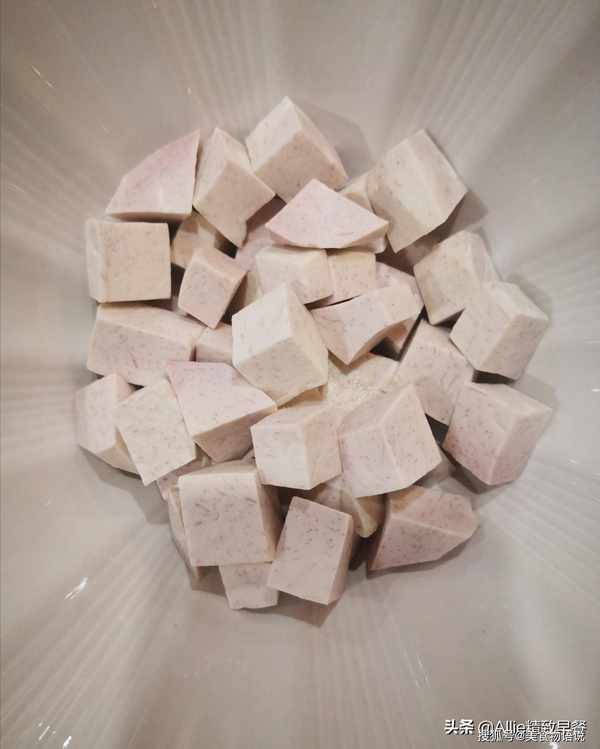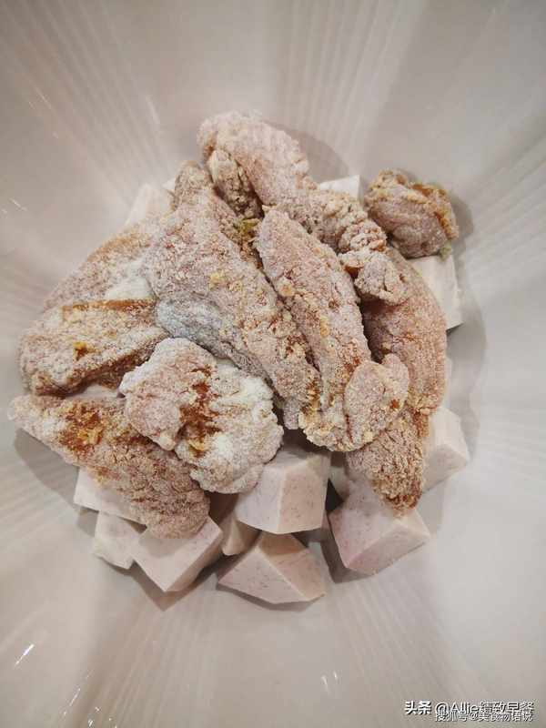 芋头切小方块,可以用土豆、红薯代替芋头,也可以不放。如果味道重,可以在芋头上撒少许盐和生抽拌匀,味道更咸而且颜色更浓。