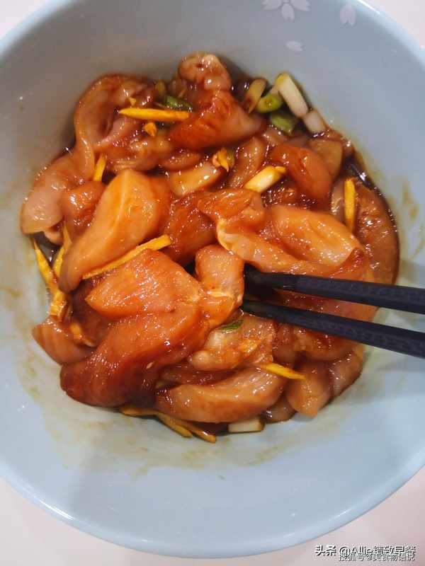 将鸡胸肉沿纹路切成约一厘米宽的细条或小块,加入姜末、葱末、盐、生抽、老抽少许、生粉。