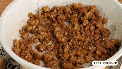 趁着蒸好的蛋羹,来做肉肠吧。不粘锅倒油,倒入之前腌制好的肉末,翻炒至肉末变色。