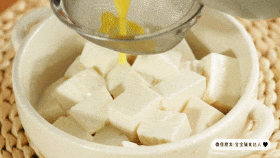 将重新混合的鸡蛋混合物过筛,倒在豆腐上。