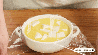 蒸碗盖上耐高温的保鲜膜,然后用牙签在上面扎几个小孔,方便热气排出。