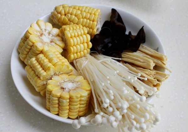 2、玉米切小块,金针菇切去头,洗净。木耳、腐竹提前泡发,山药去皮(也可不去皮)泡水备用,蔬菜洗净。
