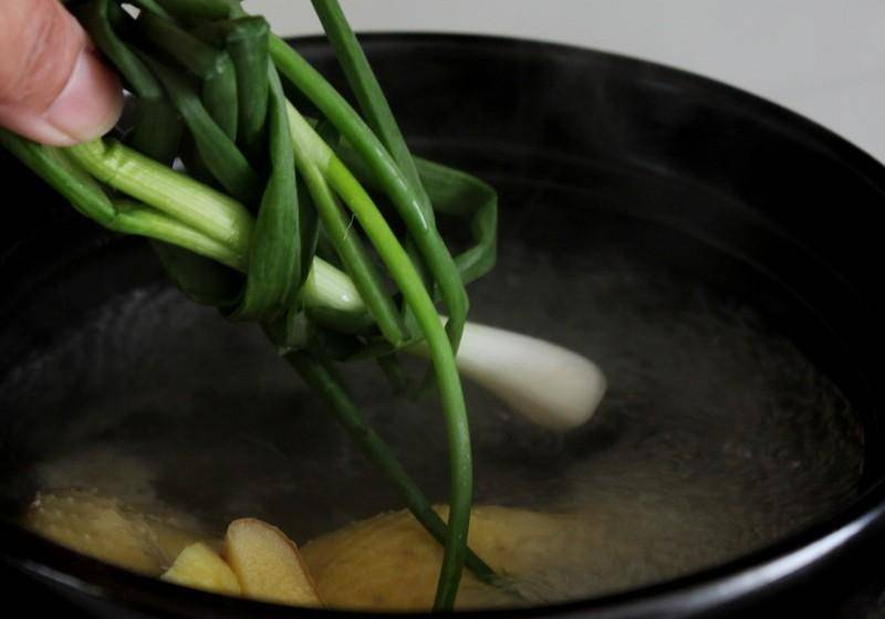 大火烧开,撇去浮沫,加入葱、姜。