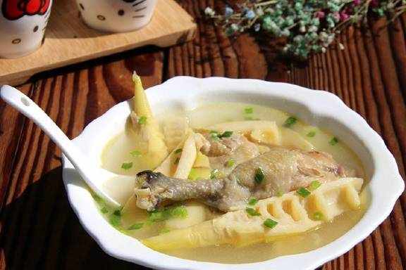 竹笋肉质鲜嫩、美味爽口,含丰富的植物蛋白以及钙、磷、铁等人体必需的营养成分和微量元素,特别是纤维素含量很高,常食有帮助消化、防止便秘的功能。所以竹笋是高蛋白,低脂肪,低淀粉,多粗纤维素的营养美食。把竹笋和土鸡搭配一起,食材相互吸收后,中和了油腻,也使得竹笋口感更加的脆嫩鲜美。详细做法请往下看;需要的食材;土鸡一只,竹笋2根黄酒2汤匙盐少许小葱3根生姜片8克