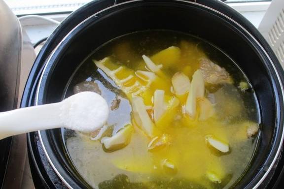 等时间到能开盖时候,打开加入竹笋,盐再盖上压5分钟即可,吃之前把表面的油撇一下,也可以不撇