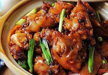 锅里热油,放入冰糖炒糖色,下入姜片和八角,下入猪蹄均匀的蘸上酱汁,再下郫县豆瓣酱,炒出红油,再加入耗油老抽,适量热水大火烧开,小火慢煮,煮大概一个半小时左右,出锅前放入青红辣椒,翻炒均匀收汁即可。