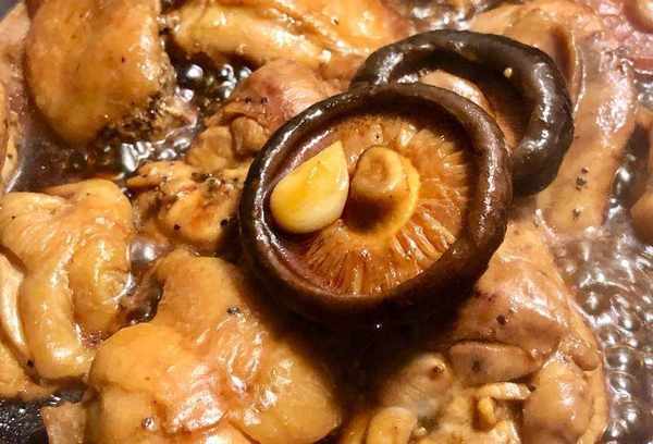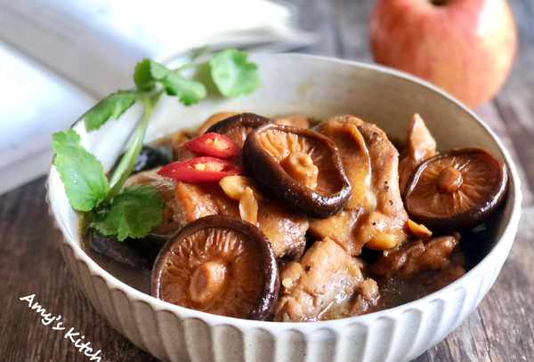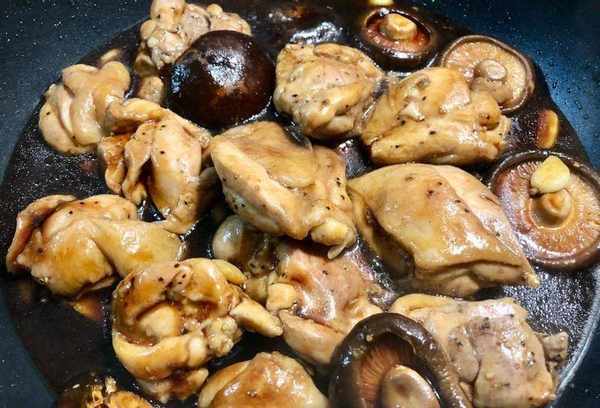 材料:去骨鸡腿3只、鲜香菇7朵、蒜头4瓣、素蚝油1汤匙、香菇水150cc