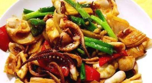 原料:500克鲜鱿,干辣椒,辣椒,姜,葱,米酒,酱油,花生油。
