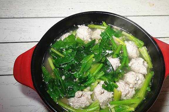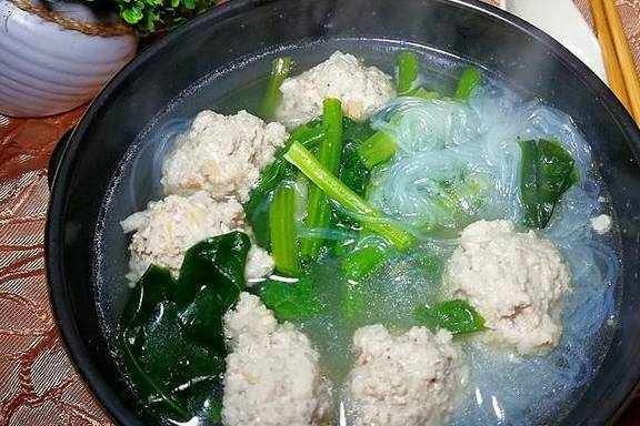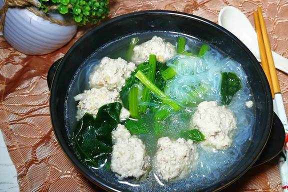 材料:菠菜250克、猪肉250克、粉丝1把、香油1汤匙、盐适量、葱1段、姜2片、白胡椒粉1茶匙、
