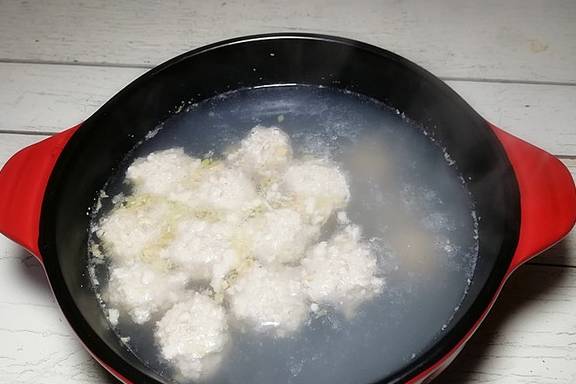 7.丸子全部放入后,开大火烧开,煮至丸子全部飘起