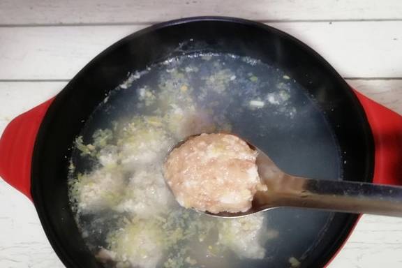 6.关小火,将肉馅放于左手中从虎口往外挤出丸子,右手用勺子接住然后放入锅内