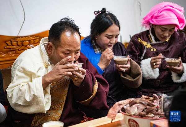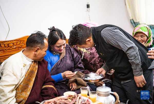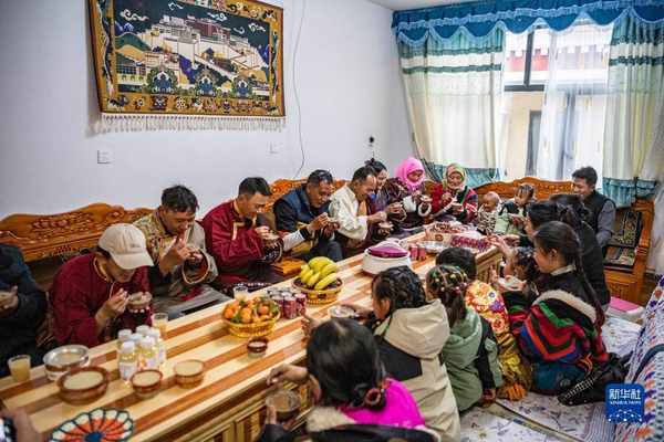 在位于森布日安置点的家中,石秀次仁(左)和家人一起吃“古突”(2月19日摄)。