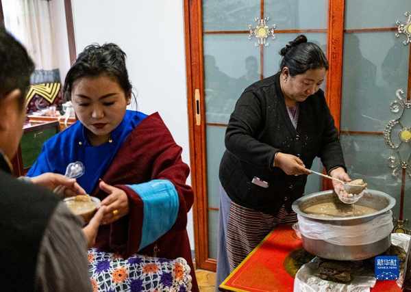 在位于森布日安置点的家中,石秀次仁的家人在盛“古突”(2月19日摄)。