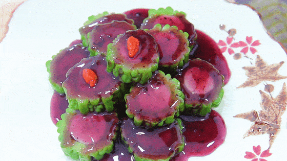 等苦瓜晾凉以后,改刀切成1厘米左右的厚片,摆放在盘中。把调好的果酱淋在上面,最后在每一片苦瓜上面,放一颗泡发的枸杞点缀一下,就能上桌食用了。