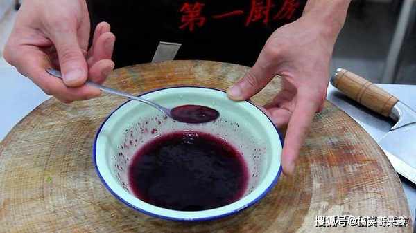 取一枚碗碟,然后倒入一点温开水。在开水里加入白糖10克、蓝莓酱20克,充分搅拌,把果酱和白糖搅化后备用。