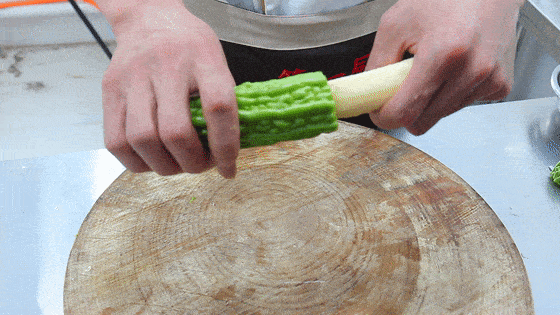 首先我们先把香蕉去皮,苦瓜去除头尾。之后把苦瓜从中间切开,用勺子把苦瓜的瓤挖干净,再把香蕉塞进苦瓜里面备用。