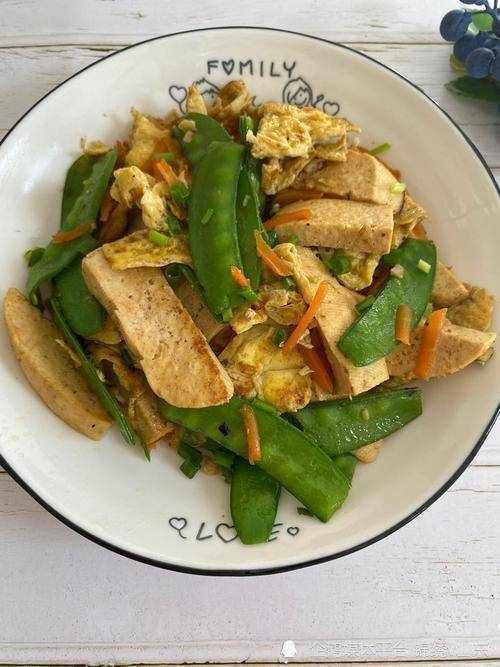 1 豆腐冲洗干净;荷兰豆去筋,泡水洗净,捞出备用