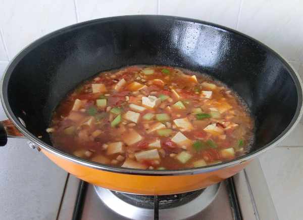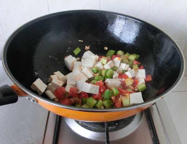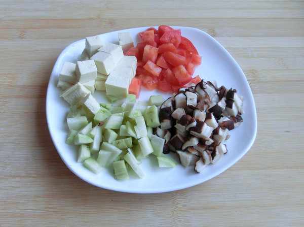 做法:1、番茄、萝卜、香菇、青蒜洗净,切丁,豆腐切丁。