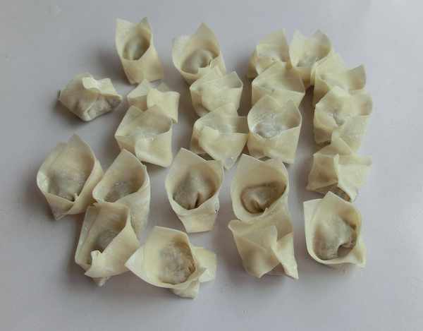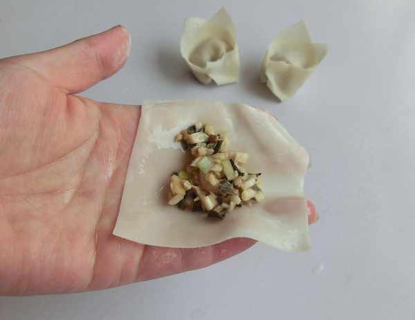 材料:杏鲍菇300克,白茶10克,馄饨皮40个,菠菜少许。