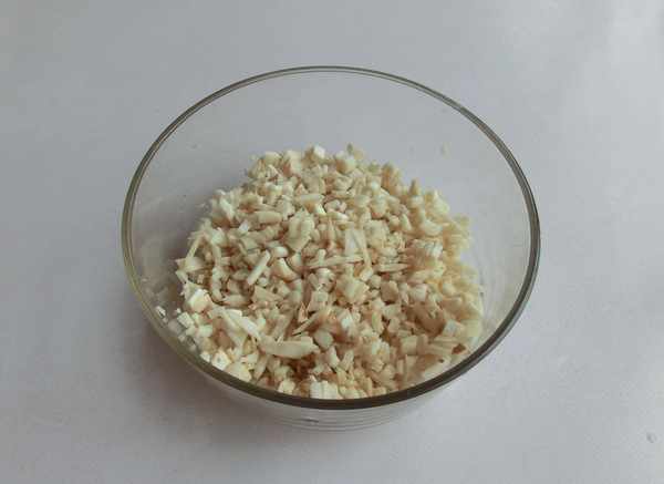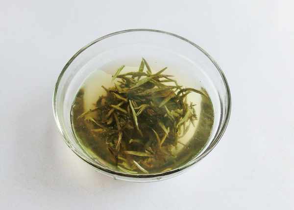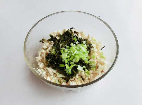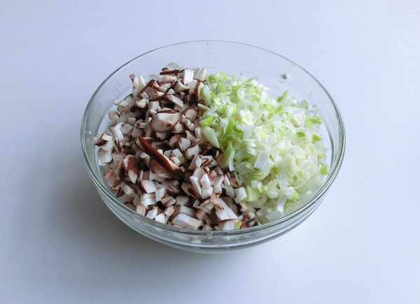 3.将茶叶过滤出来,切末,放入杏鲍菇中,再放入香葱末