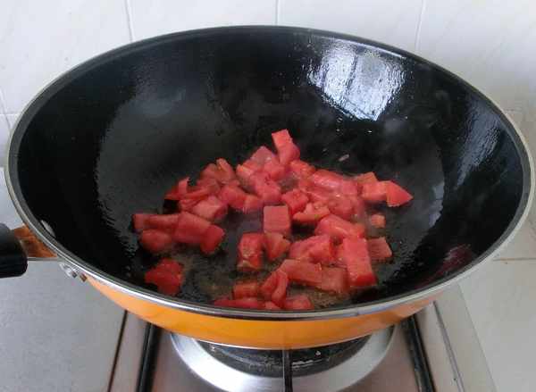 4、锅中放油,倒入番茄翻炒出汁,再加入豆腐,香菇,萝卜翻炒。