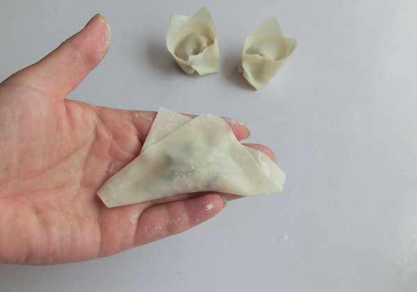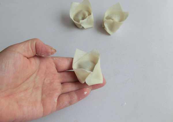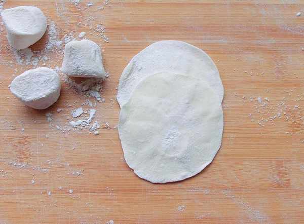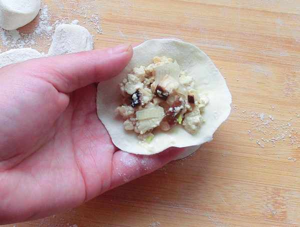 6、面团下剂,擀皮,包入馅料,捏成水饺