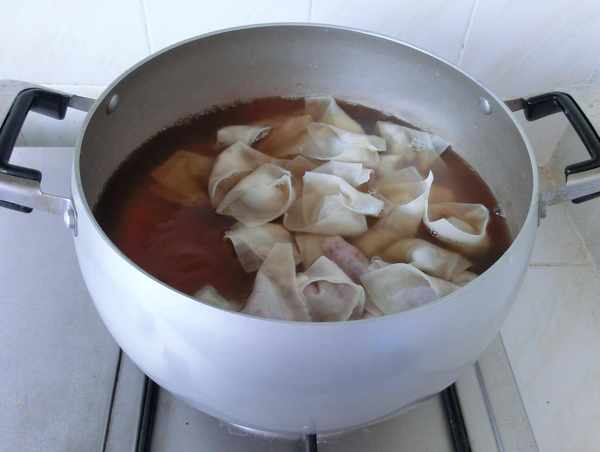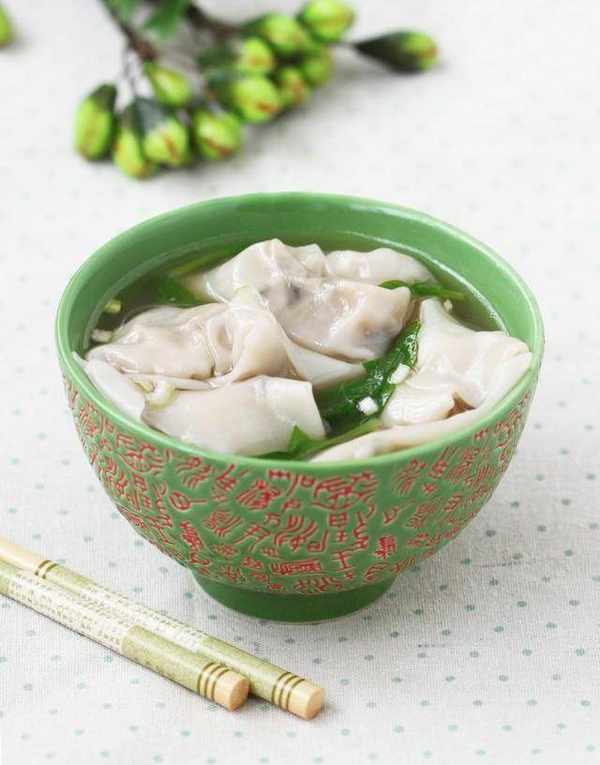 9.锅中放入茶汁,加适量清水,水开后下入包好的馄饨,煮熟后,放入少许菠菜叶,调入3克盐和鸡精即可。