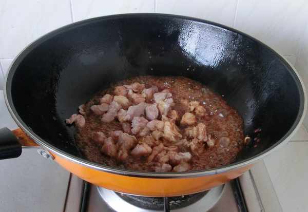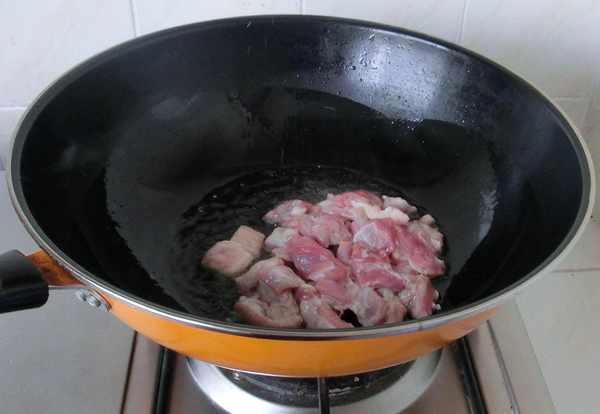 3、锅中倒油,要比平时炒菜稍多一点,油八成热的时,加羊肉翻炒,加入老抽,适量盐,八成熟后盛出备用。