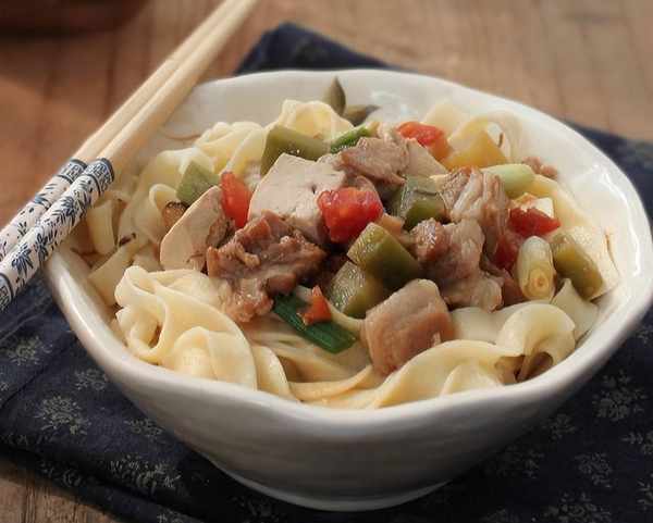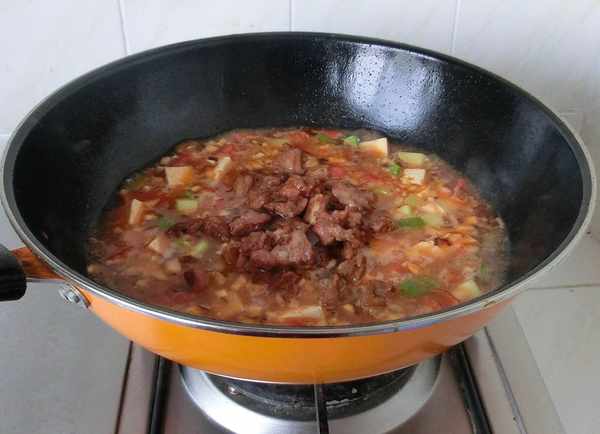 7、面条放入锅中,煮熟,调入羊肉臊子即可上桌了