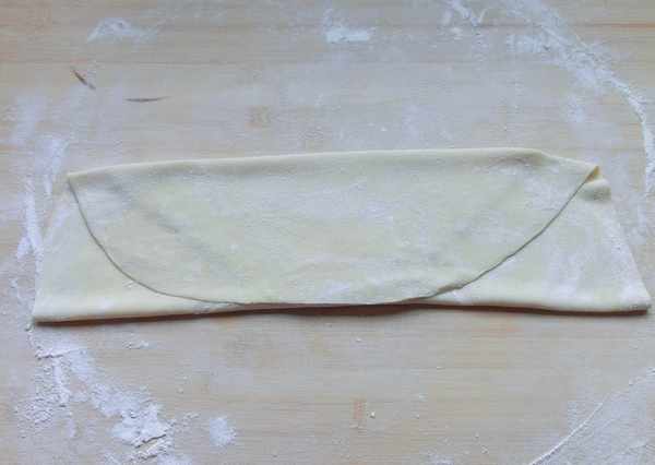 2、面板上洒上少许面粉,将面团放上再多揉一会,用擀面杖将面团擀成大圆片,将擀好的大圆片来回折叠起来,