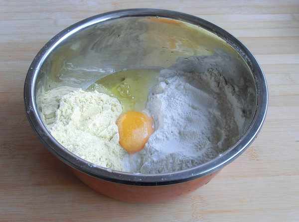 材料:面粉180克、黄豆面60克、鸡蛋1个、盐 2 克