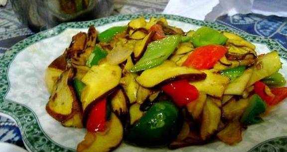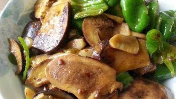 第二步,热锅后倒一点油再锅里,花椒倒下去先爆香一下,等到香味爆出后马上捞出来,别让花椒在锅里糊了。然后下入蒜片,下锅也是稍微炒出香味就好。然后切片的牛肝菌下锅,翻炒几下,倒入酱油,稍微颠一下锅,然后再撒一点点的糖提味。下入青红椒,再颠几下锅。炒到青椒短生后就可以出锅了。