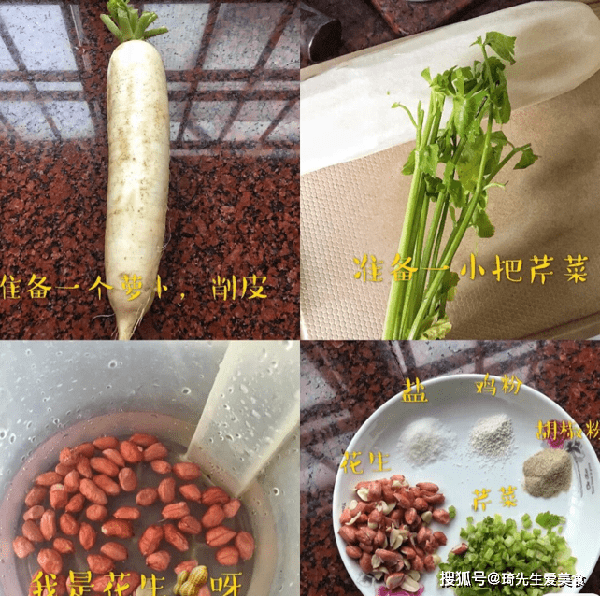 先准备一个大个头的白萝卜,一把芹菜,一把花生米,适量的盐,鸡精粉,胡椒粉(也可以加多一点五香粉,会让炸起来的丸子吃起来更香),然后把花生米切碎,芹菜切粒,放在盘子里备用
