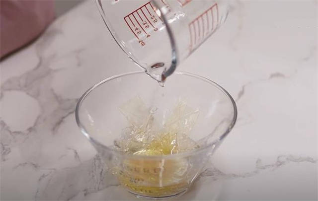 1.先准备三张的吉利丁片,这是一种食用明胶,在西点中通常起凝固、稳定结构的作用,这些一共是15g。