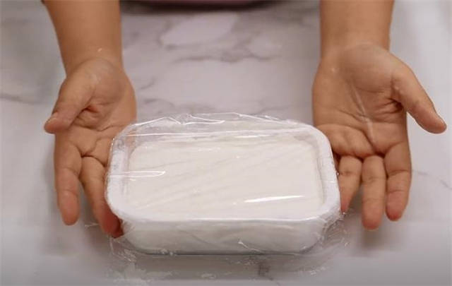 7.拿一个滤网,把刚才炒好的玉米淀粉撒在盘子里,倒上打发好的糖浆,表面再撒上一层玉米淀粉,封上一层保鲜膜,然后放在冰箱里冷藏定型。