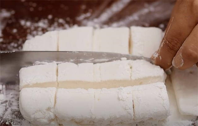 8.时间差不多到了,现在棉花糖基本上已经是定型的状态了,用刀把它切成小块即可开吃。