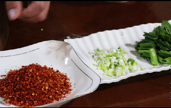 我准备了一碗辣椒面。哈哈~我们湖南人爱吃辣,所以我们放了更多的辣椒。把大大蒜切碎,把大蒜叶切成段备用。