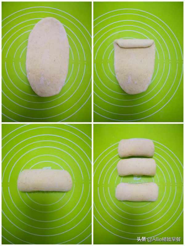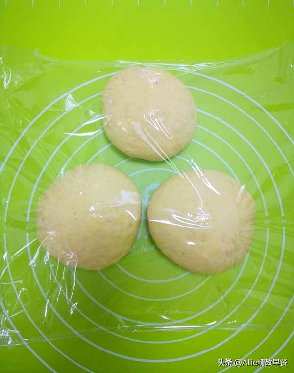面团醒好后,取出面团压出空气,然后分成三等份,揉成圆形,盖上保鲜膜,静置20分钟左右。