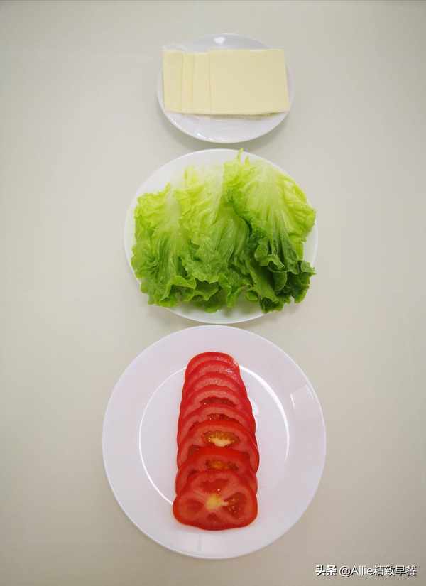 准备奶酪片、西红柿片和生菜,先洗两遍,用淡盐水浸泡10分钟,再冲洗两遍,新鲜吃比较安全。