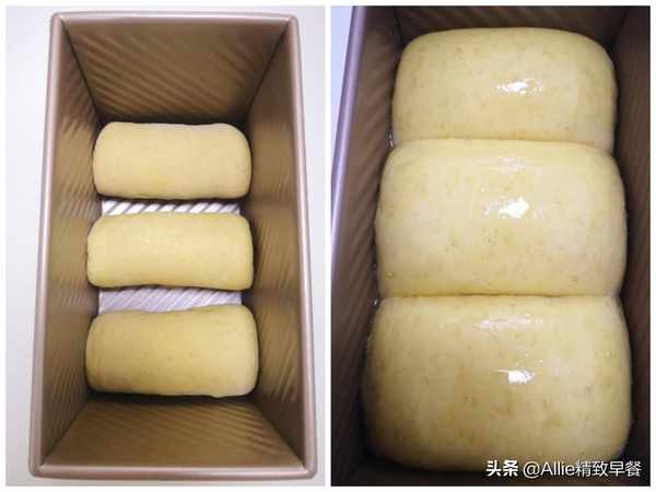 将新鲜胚卷放入吐司盒中,放入烤箱,36度烘烤至吐司盒有八九分。做方形吐司需要盖上盖子烤,发酵满8分。做骆驼吐司不需要盖,发酵到吐司盒90%满。发酵后,在表面刷一层薄薄的水或牛奶。