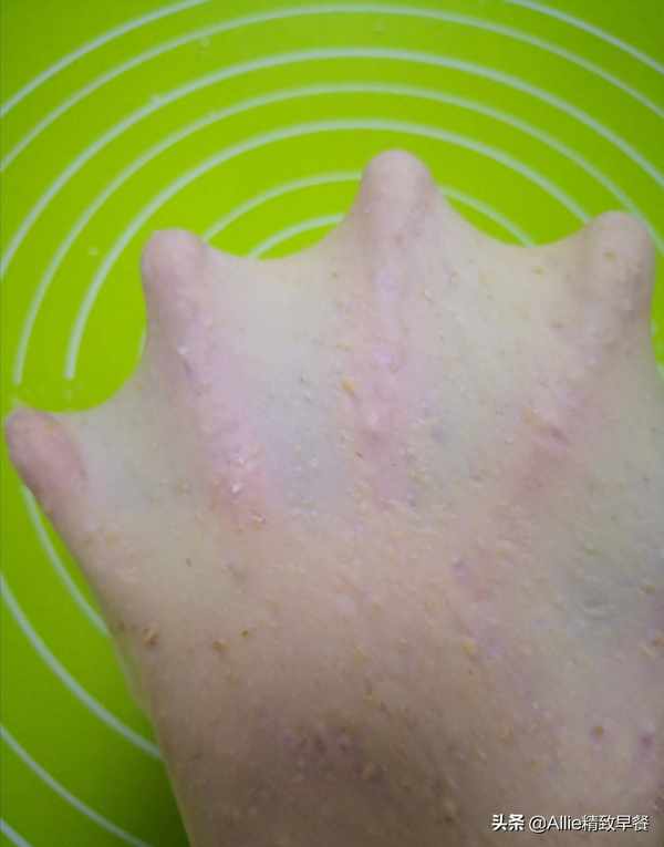 视面条的干湿程度,少量多次加入牛奶,边搅拌面粉边搅拌至大面条抖动,用手揉成软面团,然后将面团擀入锅中,揉面.与擦洗衣服一样频繁擦洗粗膜后加入少许玉米油或融化的黄油,继续擦洗手套膜。
