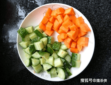 第四步,待将其煮好后,再收一下汁,将煮好的花生豆盛出来,控水放凉后放入调菜盆中待用,胡萝卜半根清洗干净后削去皮,将胡萝卜切成小碎丁,黄瓜同样清洗干净削去皮后切成小碎丁;