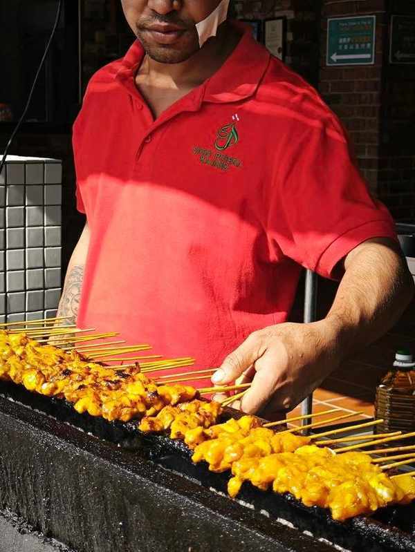 小贩挑扁担售卖沙爹串烧,肉香扑鼻炭香弥漫,远远就能闻到让人神往的香气。再来一碗沁人心扉的甜蜜煎蕊,是炎热的季候必备的食物。耳边仿佛传来孩子们的嬉闹声、摊贩的叫卖声,看见街坊邻居在闲话家常。