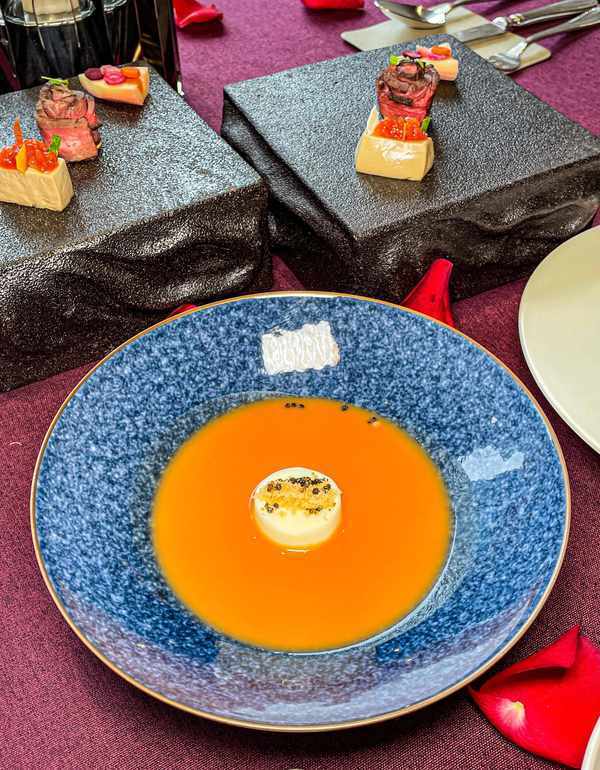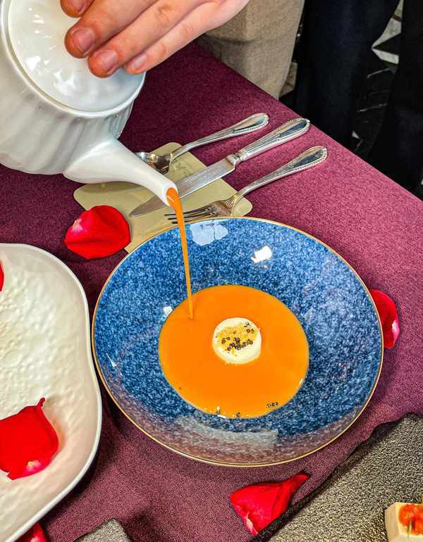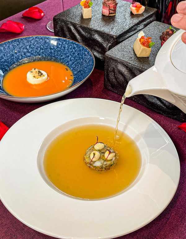 服务员会现场倒入浓郁的汤汁,最终呈现鸡牛清鲜蟹肉汤和时蔬甜蜜蟹肉慕斯浓汤