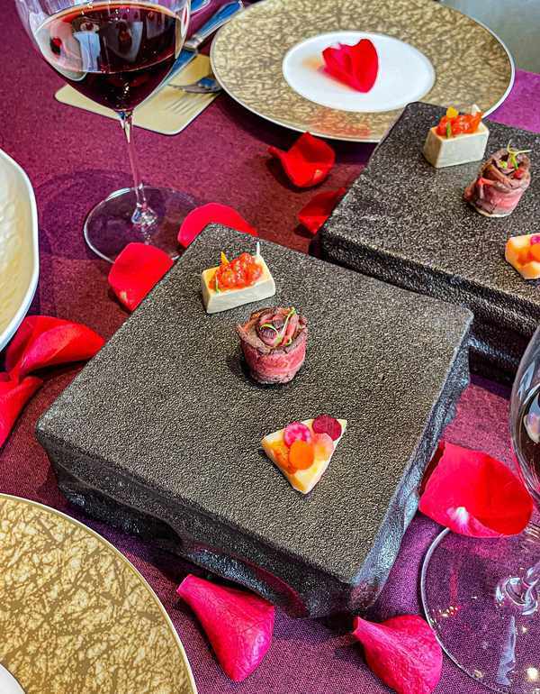 双人餐每人一份的冷头盘三味,包括:番茄糟香露杰肥干+塔塔酱低温和牛菲力+渍脆冬笋配自制蛋黄酱